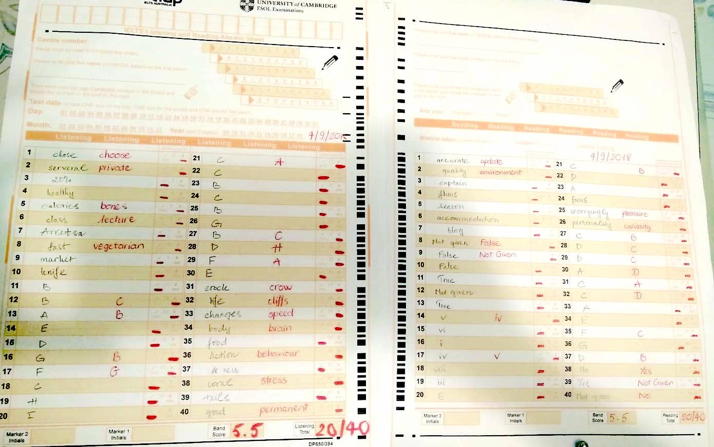 Reading: 5.5 (đúng 20/40) Listening: 5.5 (đúng 20/40) Writing: 5 Speaking: 6 Overall: 5.5