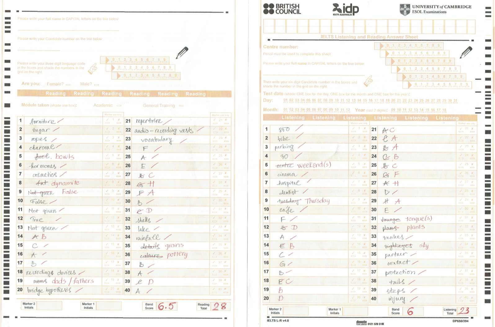 Reading: 6.5 (đúng 28/40) Listening: 6 (đúng 23/40) Writing: 5 Speaking: 5.5 Overall: 6.0