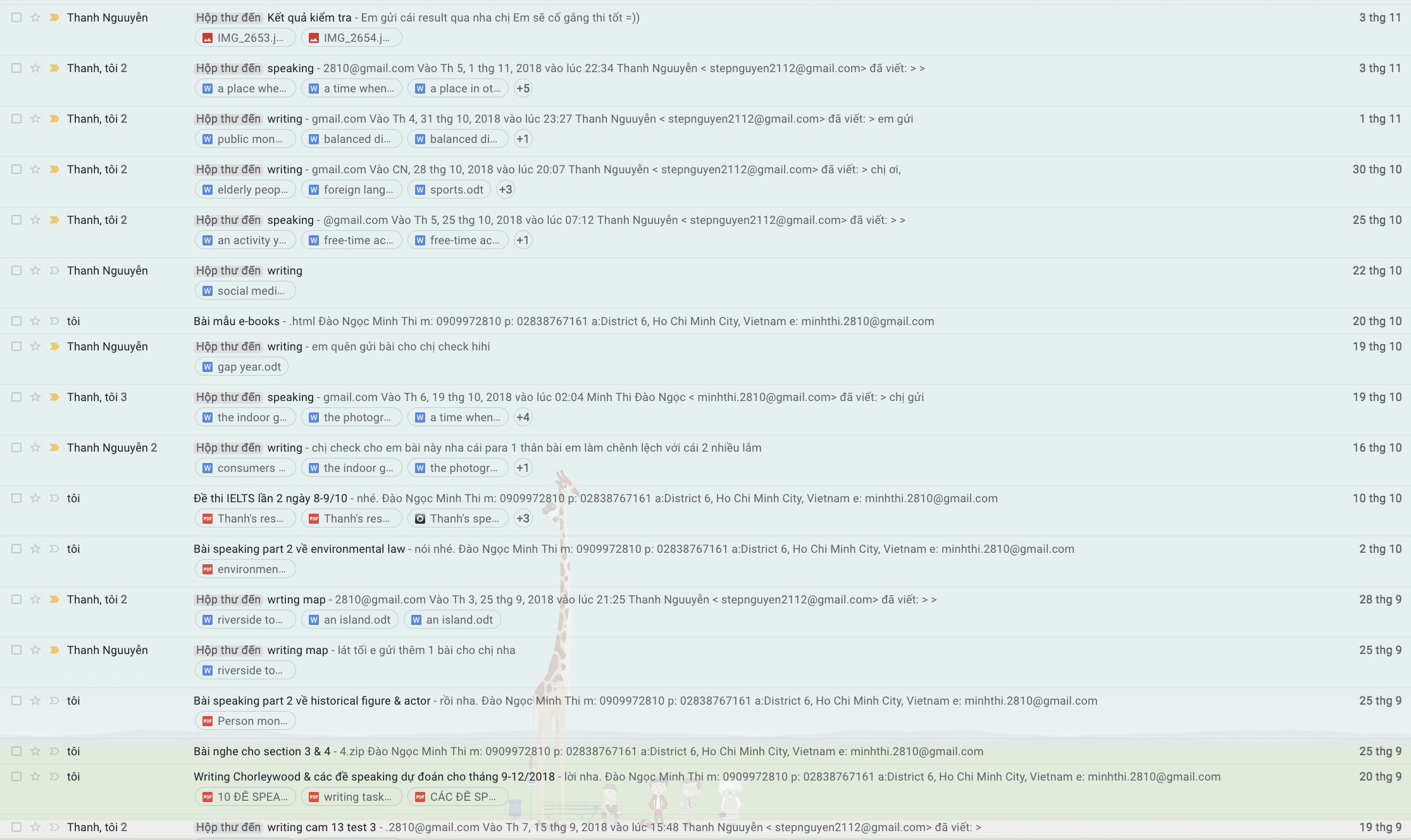 Đây là ảnh minh hoạ cho rất nhiều các email mà bạn ấy gửi bài cho cô sửa. Tính sơ sơ thì bạn đã gửi không dưới 15 bài writing & 30 bài speaking, chưa kể các bài làm trên lớp.