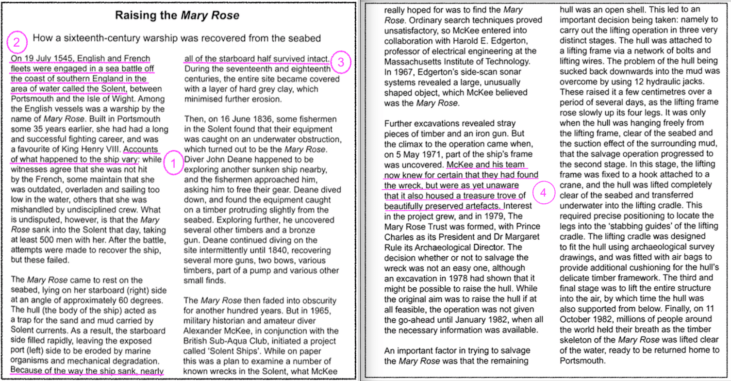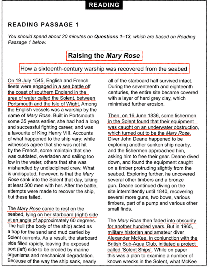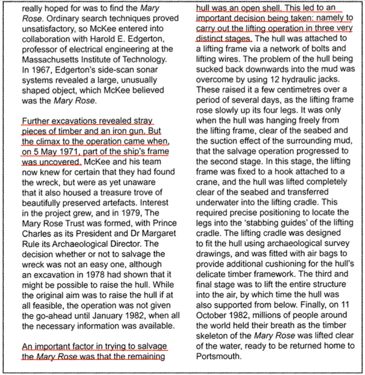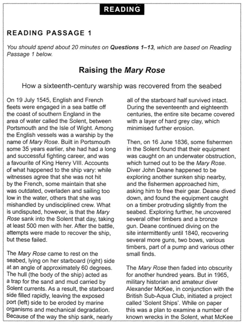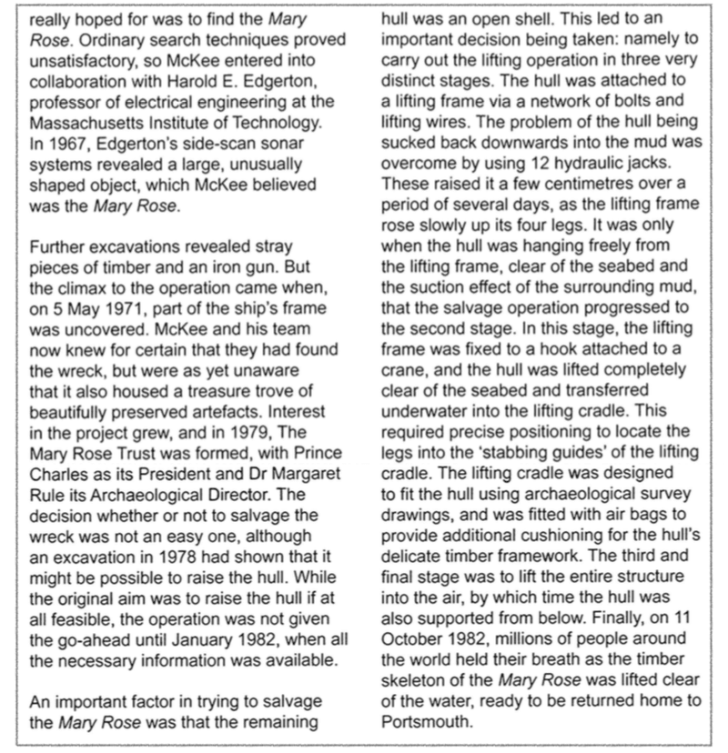 Tổng kết lại sau khi skim: bài nói về lịch sử phát hiện và cách trục vớt tàu chiến Mary Rose - một câu tàu cổ. Đầu tiên nói sơ về lịch sử con tàu này thời thế kỷ XVI. Sau đó miêu tả sơ tình trạng con tàu này chìm dưới biển. Nó tình cờ được phát hiện ra bởi những ngư dân nhưng rồi sau đó bị chìm vào quên lãng cho đến tận năm 1965 thì dự án Solent Ships được tiến hành. Cuộc thăm dò và tìm kiếm con tàu thu được 1 số kết quả và cuối cùng là các bước của quá trình trục vớt nó lên.