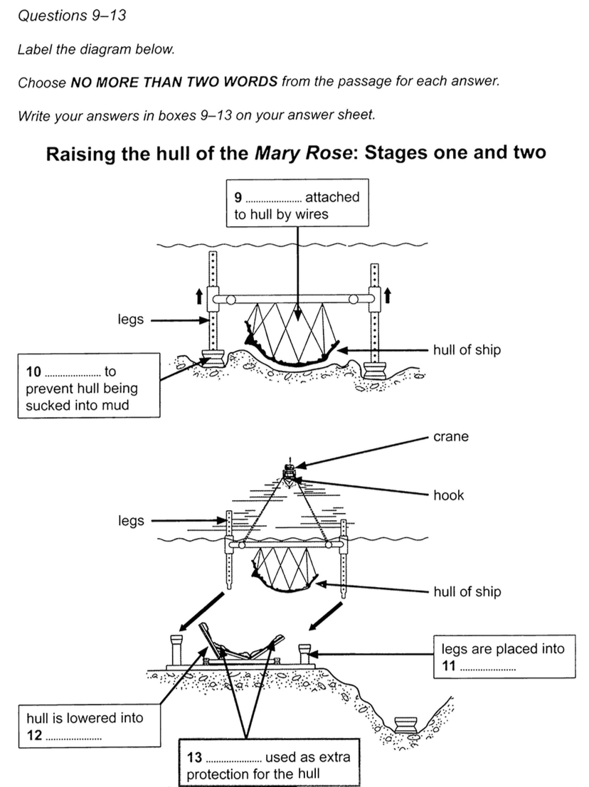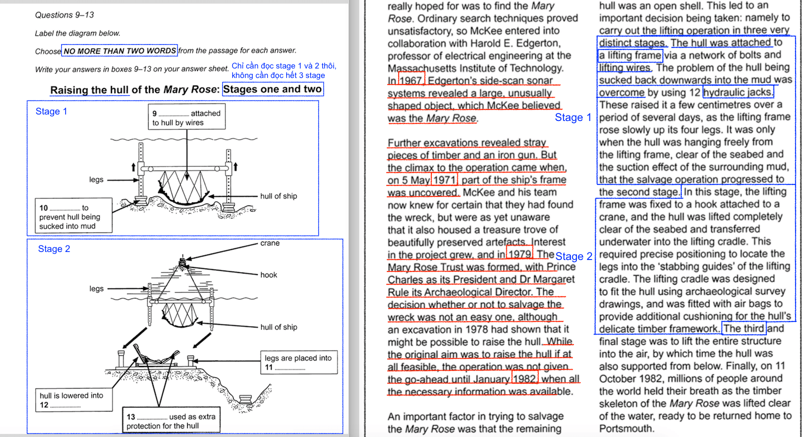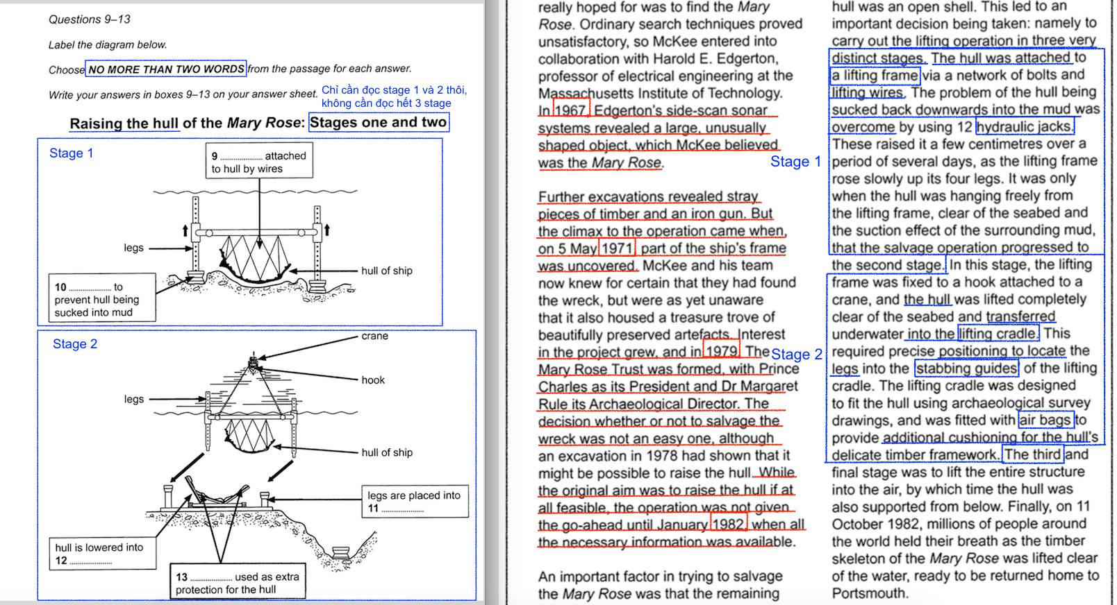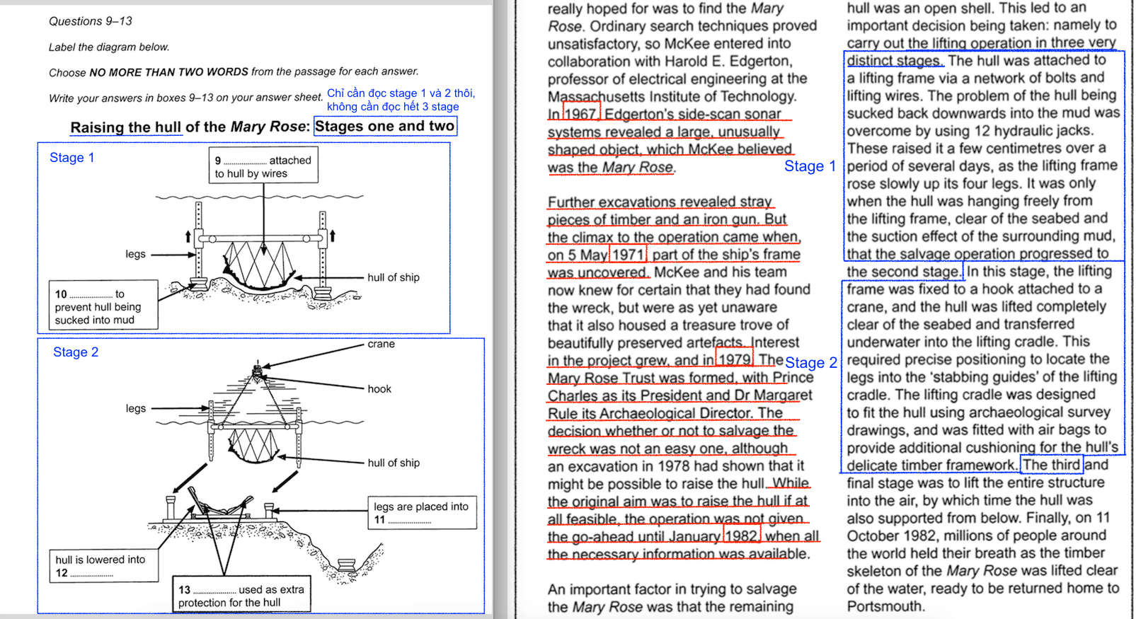 Như đã biết, dạng bài tập labeling diagram này thì thông tin chỉ nằm ở 1 -2 đoạn văn trong bài đọc chứ không nằm rải rác toàn bài nên mình cần tìm đoạn nói về cái diagram thôi. Đọc trong bài mình sẽ thấy tiến trình trục vớt có 3 stage, nhưng đề chỉ yêu cầu stage 1 & 2, thì chỉ cần đọc nhiêu đó thôi, không cần đọc stage 3 (thấy từ 'third stage' là biết đọc từ chỗ đó trở lên trên chứ không cần đọc khúc dưới). Đề có 2 cái hình thì tương đương là mỗi hình cho 1 stage, vậy là stage 1 là hình trên, stage 2 là hình dưới (thấy từ 'second stage' thì đánh dấu nó lại để biết là khúc trên là stage 1, lát scan khúc này để trả lời hình trên; còn khúc ở giữa từ 'second stage' đến 'third stage' là chỗ thông tin scan cho hình dưới). Vậy là mình đã khoanh vùng được chi tiết rồi, chỉ tìm tìm từ nữa thôi. Vậy nên mình nhấn mạnh lại là kỹ năng khoanh vùng thông tin là CỰC KỲ QUAN TRỌNG.