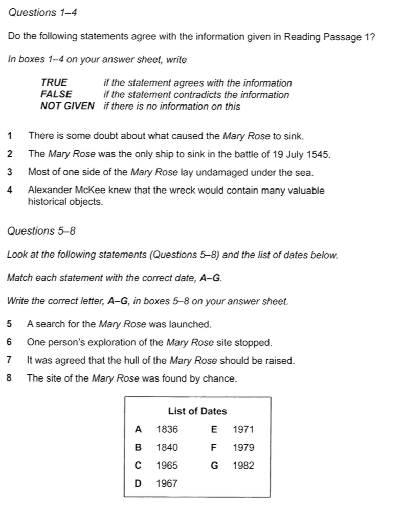 1. T. Câu trong bài và câu trong đề có ý giống nhau được paraphrase lại. Câu trong bài: Accounts of what happened to the ship vary....What is undisputed, however, is that the Mary Rose sank into the Solent that day/ Nhiều giả thuyết về điều xảy ra với Mary Rose đã được đưa ra .... Tuy vậy, điều không thể chối cãi là Mary Rose đã chìm xuống vùng biển Solent ngày hôm ấy. Trong đề: There is some doubt about what caused the Mary Rose to sink / Có vài sự nghi ngờ về thứ đã làm đắm tàu. Tức là không biết lý do gì tàu bị đắm, nhiều người đặt nhiều giả thuyết này nọ.