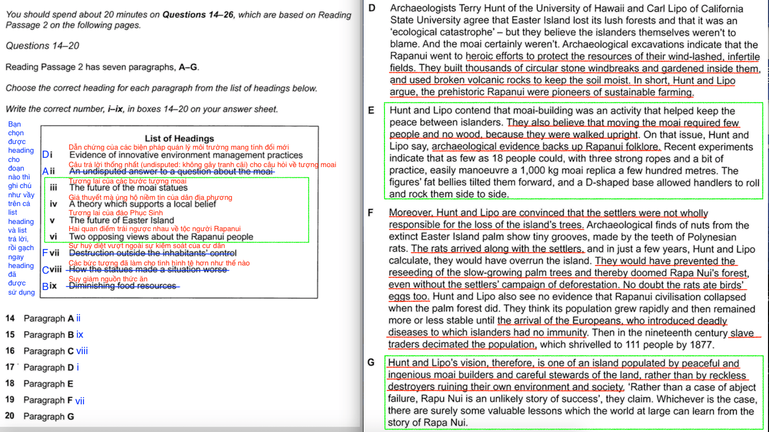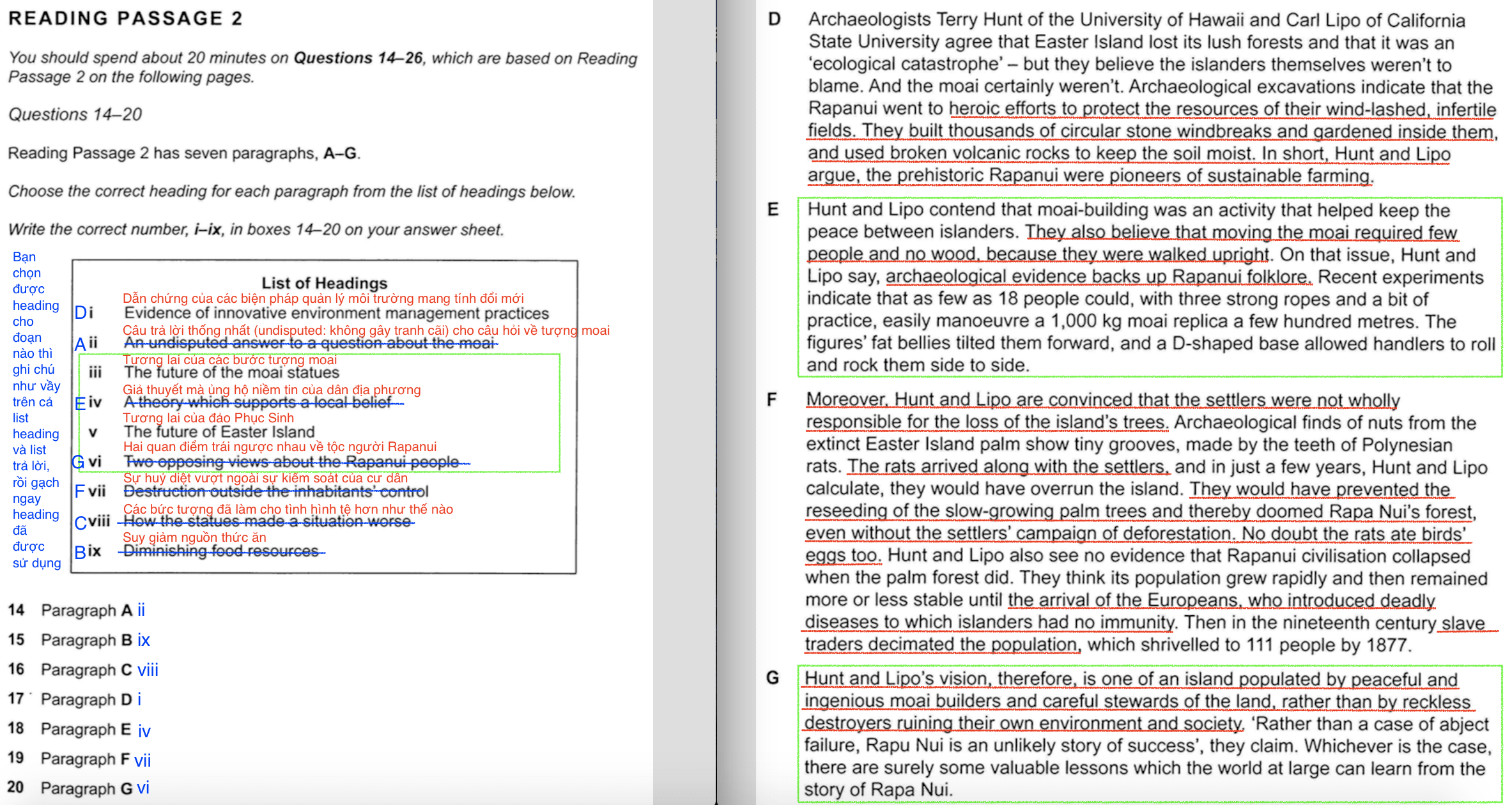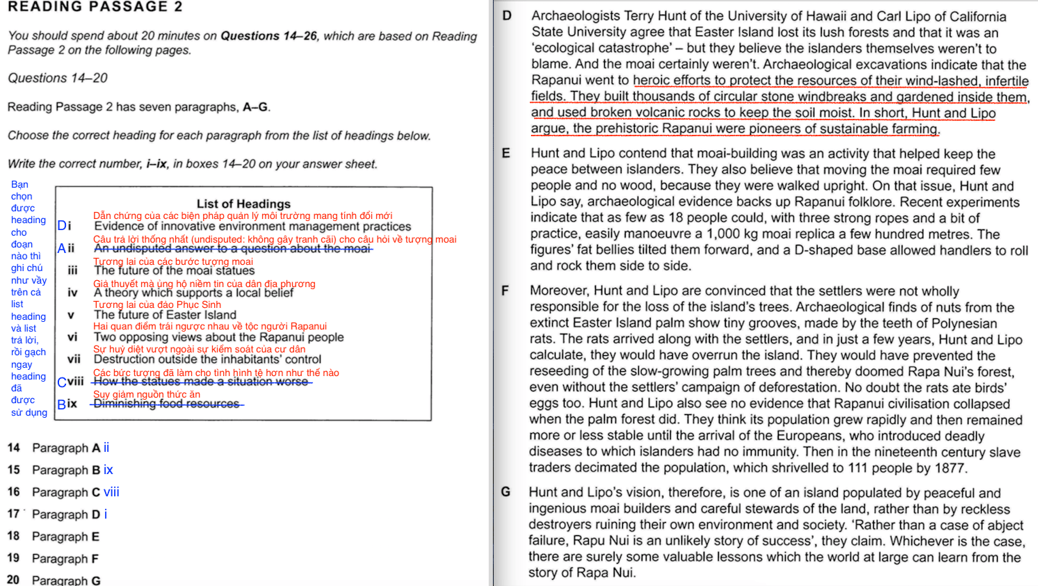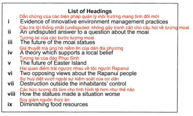 Bạn chỉ còn 3 headings để thực hiện 'In any cases, it can't be this answer'. Đọc nội dung đoạn này ta thấy nó không hề đề cập gì đến tương lai, viễn cảnh sau này của Moai hay đảo Phục Sinh, mà chủ yếu là nói về những nhận định của Hunt & Lipo, do đó ta loại ngay 2 headings "The future ..." và chọn đáp án còn lại là heading vi - Two opposing views about the Rapanui people.