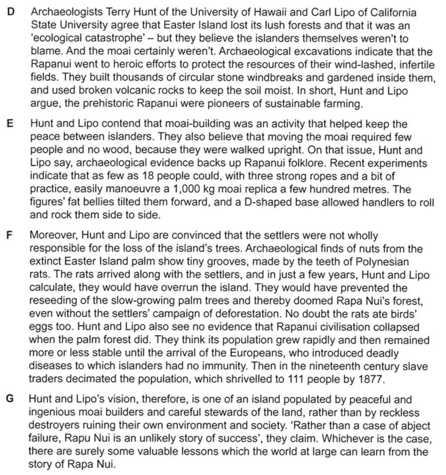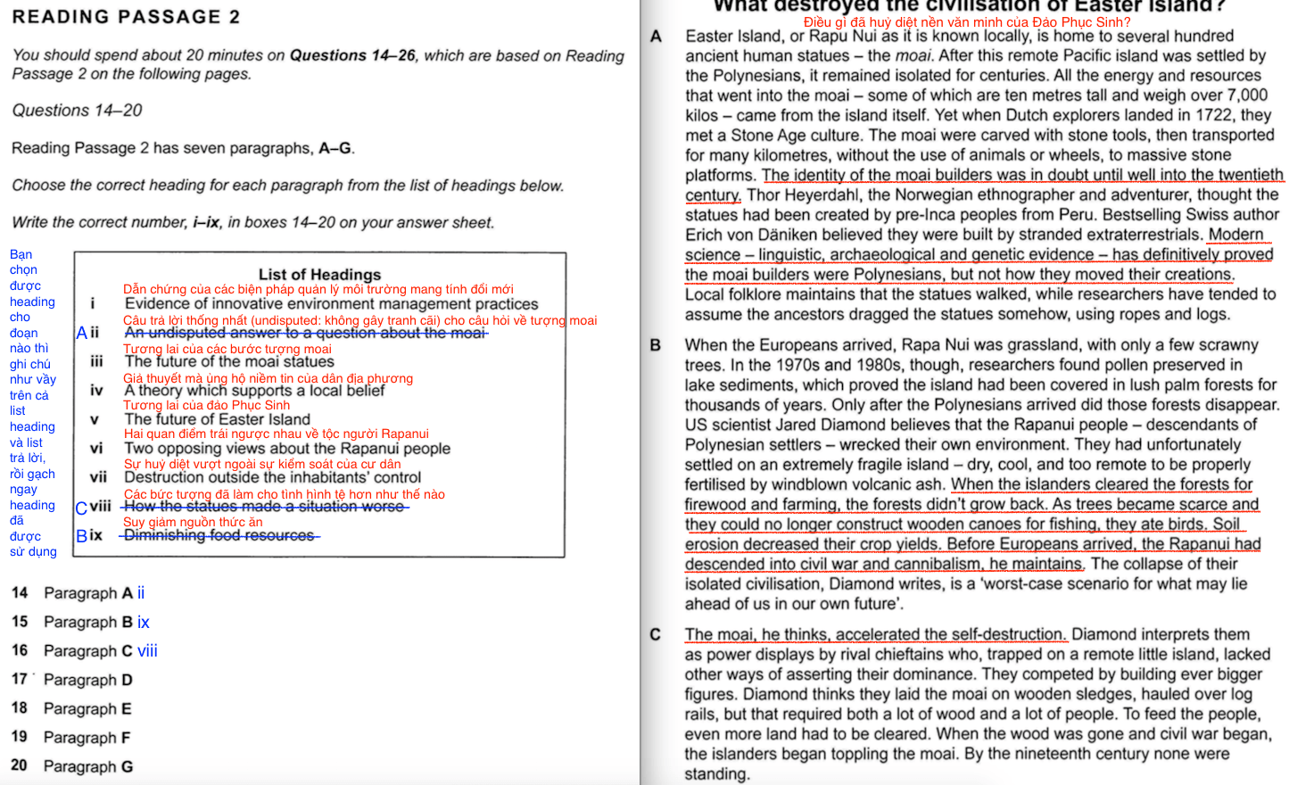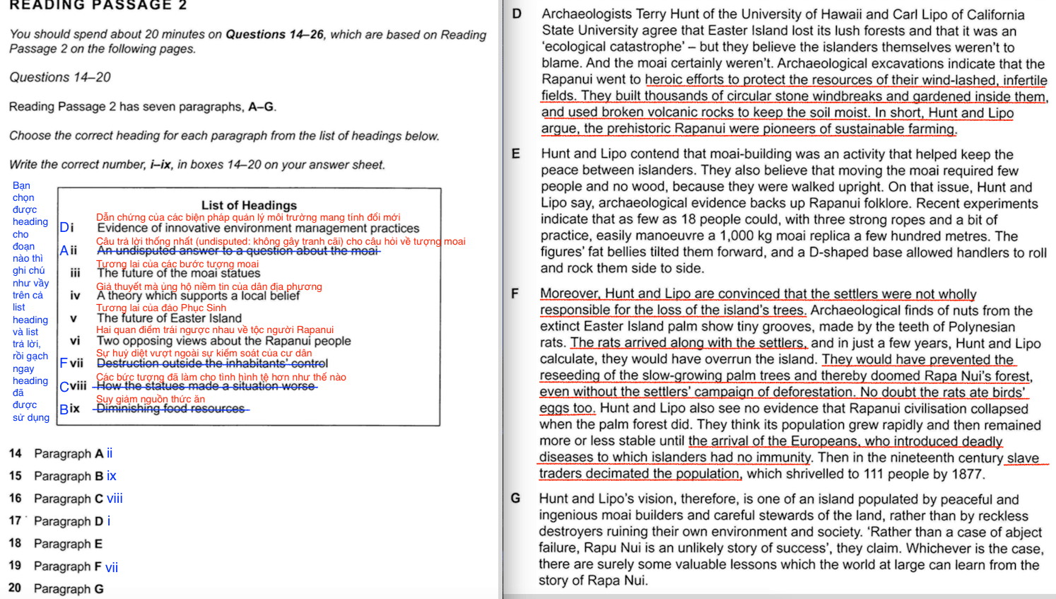 Bạn chỉ còn 3 headings để thực hiện 'In any cases, it can't be this answer'. Đọc nội dung đoạn này ta thấy nó không hề đề cập gì đến tương lai, viễn cảnh sau này của Moai hay đảo Phục Sinh, mà chủ yếu là nói về những nhận định của Hunt & Lipo, do đó ta loại ngay 2 headings "The future ..." và chọn đáp án còn lại là heading vi - Two opposing views about the Rapanui people.