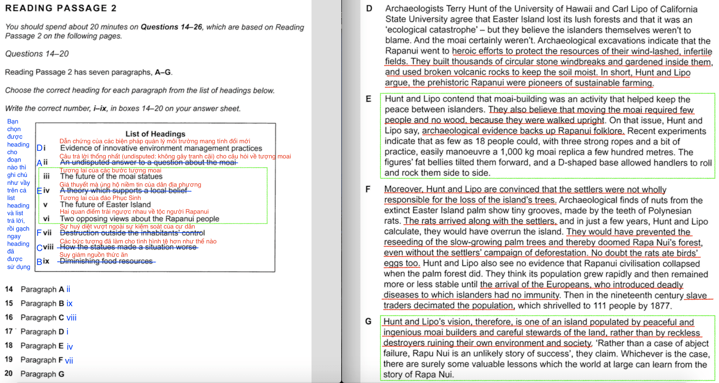 Mình đọc đoạn E và sẽ thấy đoạn này mô tả cách các bức tượng này được di chuyển, cụ thể hơn là di chuyển theo chiều thẳng đứng. Cần khoảng 18 người, những sợi dây thừng và luyện tập, v.vv... Vậy thì chắc chắn nó không thể là 2 heading "the future of ...." rồi vì đâu có nói về viễn cảnh tương lai. Vậy chỉ còn lại heading iv - A theory which supports the local belief và vi - two opposing views about the Rapanui people. Giữa 2 headings này thì vi là heading ít có khả năng đúng vì trong đoạn văn chả thấy nói gì về 2 quan điểm trái ngược nhau cả, chỉ nói về nghiên cứu và quan điểm của Hunt và Lipo thôi. Loại đến cuối cùng thì còn lại đáp án iv - A theory which supports the local belief.