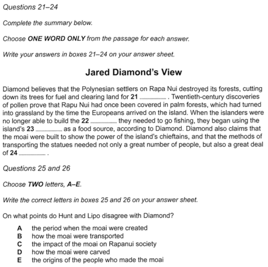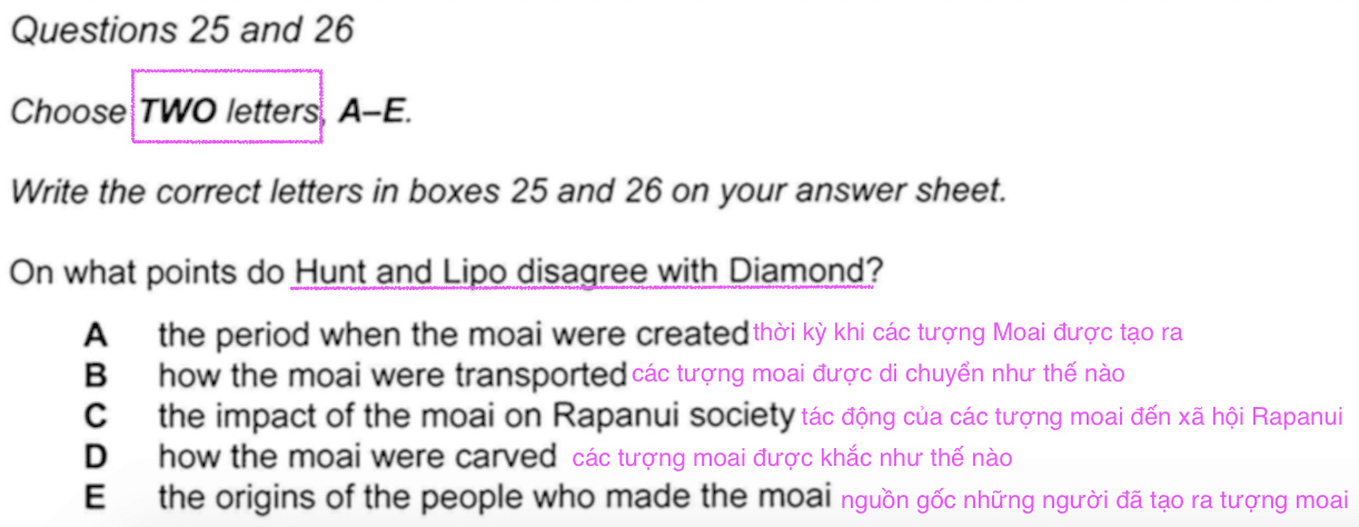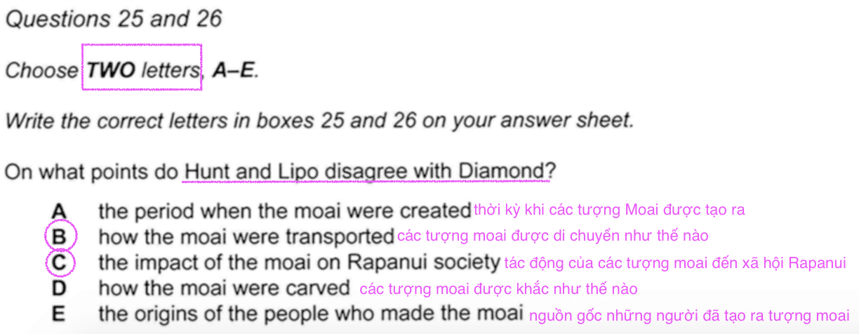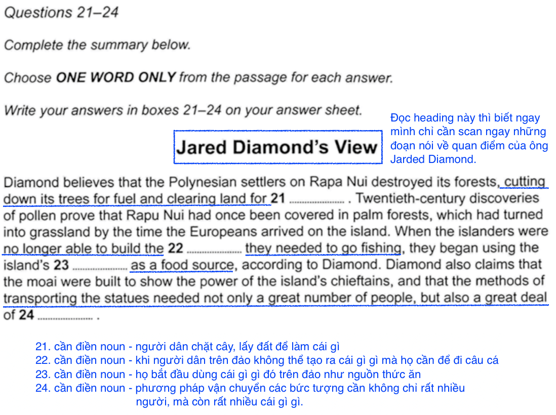 Câu hỏi kêu mình chọn 2 điểm mà Hunt & Lipo không đồng tình với Diamond. Có thể bạn sẽ scan ngay đoạn G vì đó là đoạn mà có heading 'Two oppoing ideas about the Rapanui', nhưng scan xong bạn sẽ thấy mơ hồ và chưa biết chọn thế nào, đơn giản là vị mình scan sai chỗ rồi. Vậy nên phải scan tiếp.