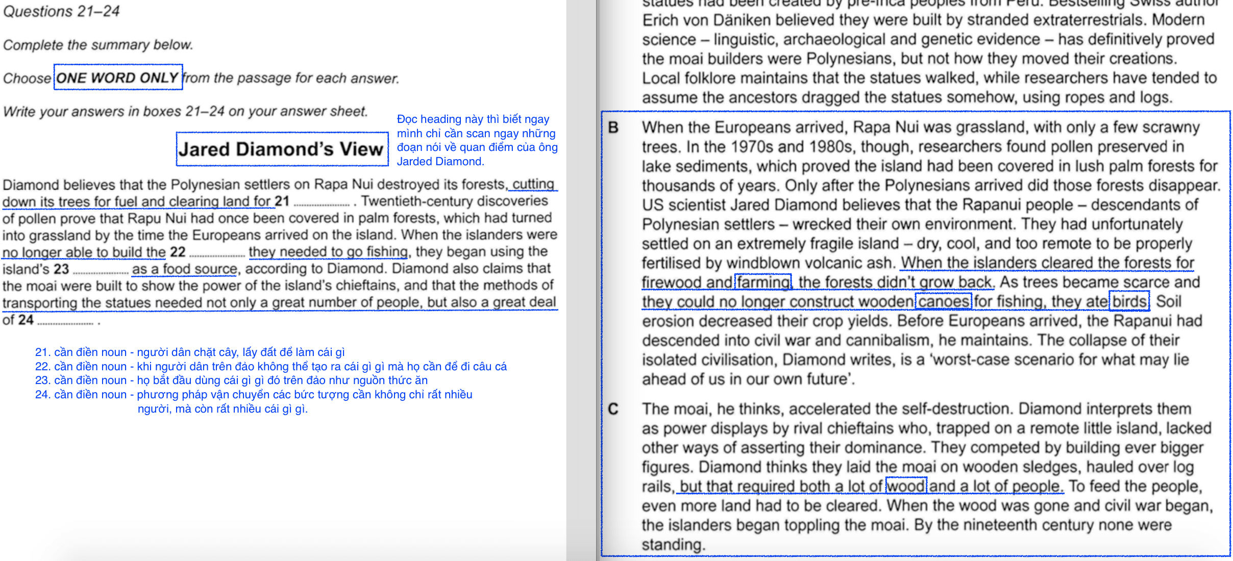 Việc đầu tiên là phải đi kiếm những đoạn mà có xuất hiện tên Jared Diamond vì đó sẽ là những đoạn nói về quan điểm của ông này. Lúc này mình sẽ nhớ lại đó chính là 2 đoạn B & C, vậy giờ chỉ cần đọc xong 2 đoạn này để chọn từ. Nhớ kỹ là ONE WORD ONLY nha.