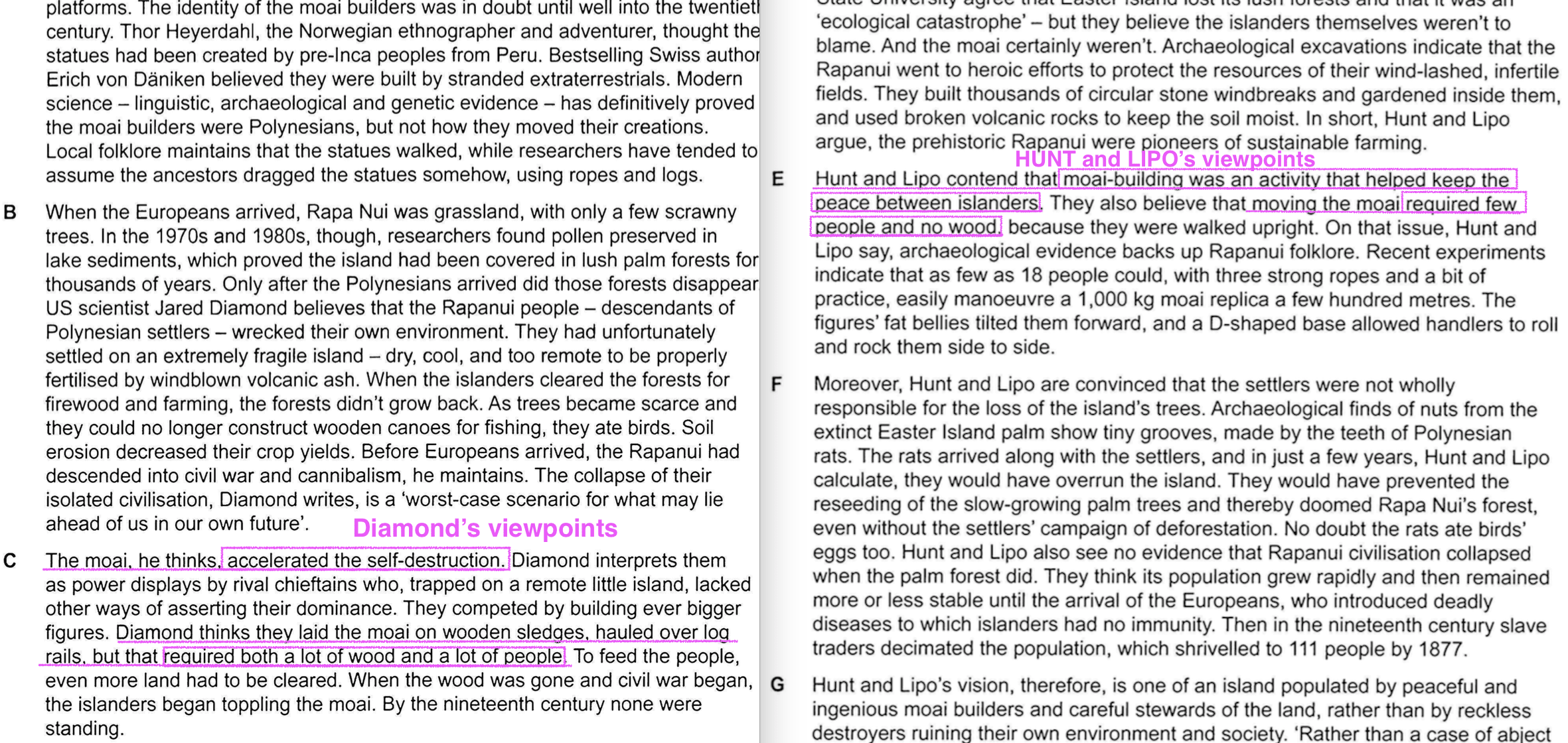Để hiểu lý do tại sao heading câu này là Two opposing ideas thì bạn phải đọc kỹ ngay những chỗ 'rather than' và đọc lại ngay đoạn B với câu: "US scientist Jared Diamond believes that the Rapanui people – descendants of Polynesian settlers – wrecked their own environment / Nhà khoa học Mỹ Jared Diamond tin rằng những người Rapanui – hậu duệ của cư dân Polynesia – đã tàn phá môi trường của chính họ." --> Điều này cho thấy 2 luồng quan điểm trái ngược về người Rapanui của các nhà khoa học. Diamond cho rằng người Rapanui tự phá huỷ môi trường sống, làm tượng nhiều và khiến tình hình tệ hơn; trong khi Hunt & Lipo có quan điểm không thể đổ hết lỗi cho họ và người Rapanui có nhiều đóng góp tích cực trong việc chăm sóc vùng đất của mình.