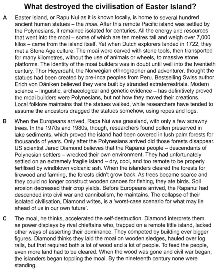 Các phần dịch song ngữ Anh - Việt mình tham khảo từ trang này: https://learnvocabinieltsreading.wordpress.com/2017/06/04/dieu-gi-da-pha-huy-nen-van-minh-cua-dao-phuc-sinh/