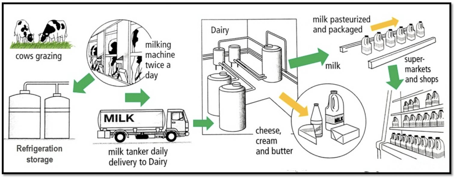 The diagram below shows the production and processing of milk and dairy products for commercial sale.