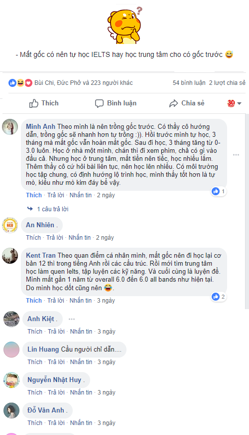 90% các bạn mất gốc bắt đầu học IELTS đều băn khoăn không biết có nên tự học hay đi học trung tâm trước để lấy lại gốc? Bạn thì sao?