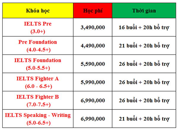 Với 9 cơ sở tại Hà Nội, TPHCM, DN, IELTS Fighter tự tin cung cấp các khóa học chất lượng, giảng dạy uy tín, cam kết không đạt học lại miễn phí. Đây là học phí khóa học: