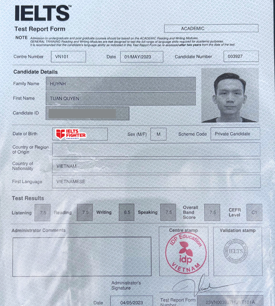 Ngày nhận được kết quả, mình khá là vui với 9.0 Listening, 8.5 Reading cũng như 7.0 phần Writing và cuối cùng là 6.0 Speaking. Tuy có chút thiếu may mắn khi thi Speaking nhưng kết quả vẫn khiến em cảm thấy hài lòng. Cảm ơn đội ngũ của IELTS Fighter Bà Hom đã giúp em đạt được mức điểm mong muốn trong thời gian gấp rút như vậy. Em và các thầy cô đều rất vui vì công sức của mọi người đã được đền đáp.