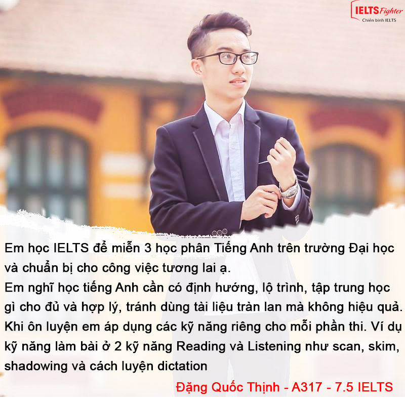 Quốc Thịnh hiện đang là sinh viên năm 2 trường Đại học Kinh tế Quốc dân ngành Quản trị khách sạn. Theo Thịnh cho biết, ngành của bạn ấy càng giỏi tiếng Anh thì càng tốt nên việc học IELTS đã trở thành mục tiêu của bạn ngay từ năm nhất đại học. Đặc biệt mục tiêu trước mắt chính là: " Mình học IELTS để miễn 3 học phân Tiếng Anh trên trường Đại học. Ngoài ra mình thi IELTS cũng để kiểm tra trình độ tiếng Anh và thử thách bản thân, nếu có cơ hội du học càng tót.