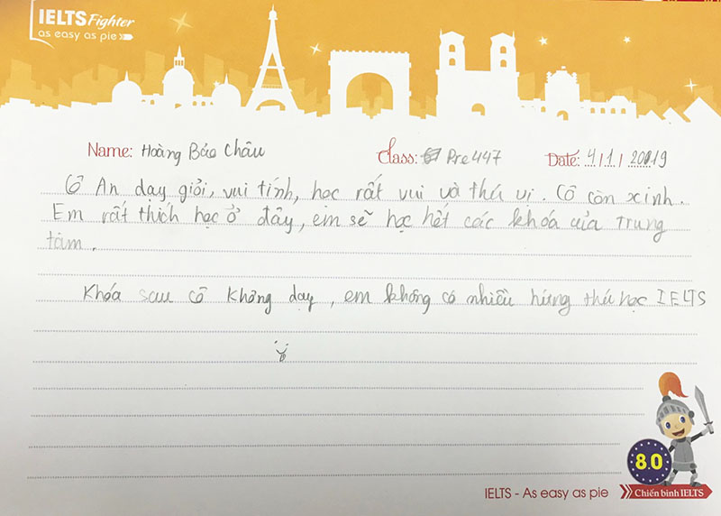 Hoàng Bảo Châu: " Cô An dạy giỏi, vui tính, học rất vui và thú vị. Em rất thích học ở đây, em sẽ học hết khóa của trung tâm."