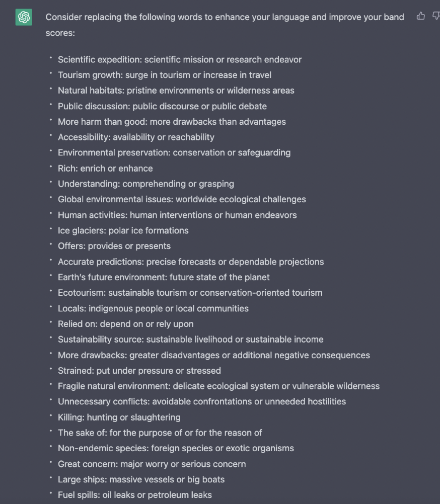 Bên cạnh đó, Chat GPT cũng có thể đưa các gợi ý sử dụng các từ vựng khác trong bài Writing để nâng band điểm bài viết của các bạn bằng cú pháp "Suggest some words to replace the words I use in order to improve my band scores” + bài Writing của các bạn