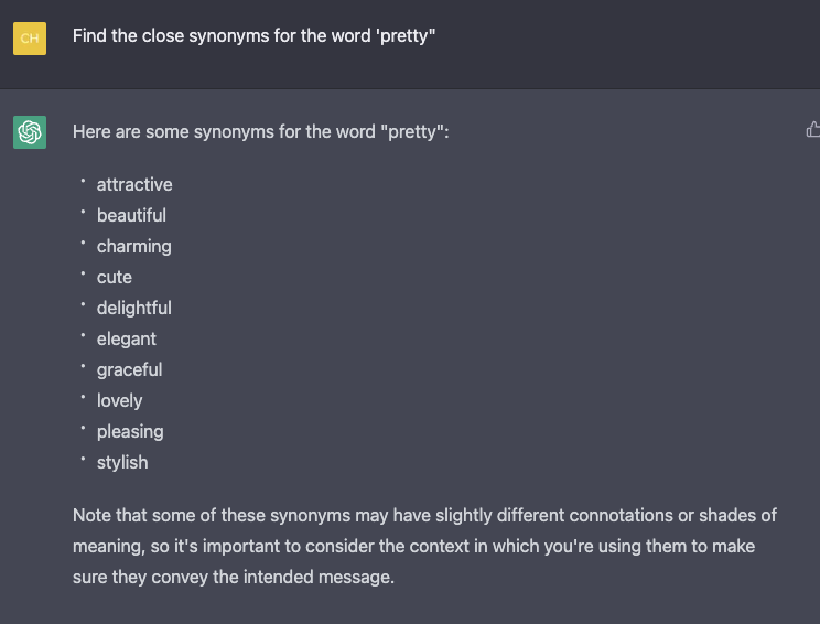 Các bạn có thể yêu cầu Chat GPT tìm những từ đồng nghĩa bằng câu lệnh sau: “Find the close synonyms for the word…” - chat GPT sẽ trả lại kết quả với hàng loạt các từ đồng nghĩa.