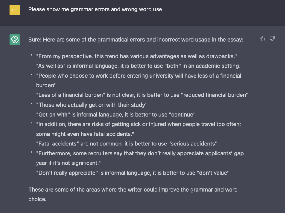 Người sử dụng có thể yêu cầu Chat GPT sửa các lỗi sai về grammar của câu trả lời bằng cách nhập câu trả lời vào ô chat. Chat GPT sẽ chỉ ra các lỗi sai cũng như đưa ra các nhận xét để các bạn có thể rút kinh nghiệm nhằm cải thiện sự fluency và grammarly correct của mình bằng cách gõ “Please show me grammar errors and wrong word use" + câu trả lời của các bạn.