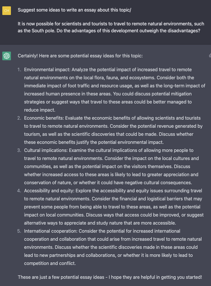 Người học có thể đặt câu hỏi như sau để yêu cầu Chat GPT đưa ra các gợi ý về ý tưởng cũng như cách triển khai bài luận bằng một số yêu cầu như: Suggest some ideas to write an essay about this topic/
