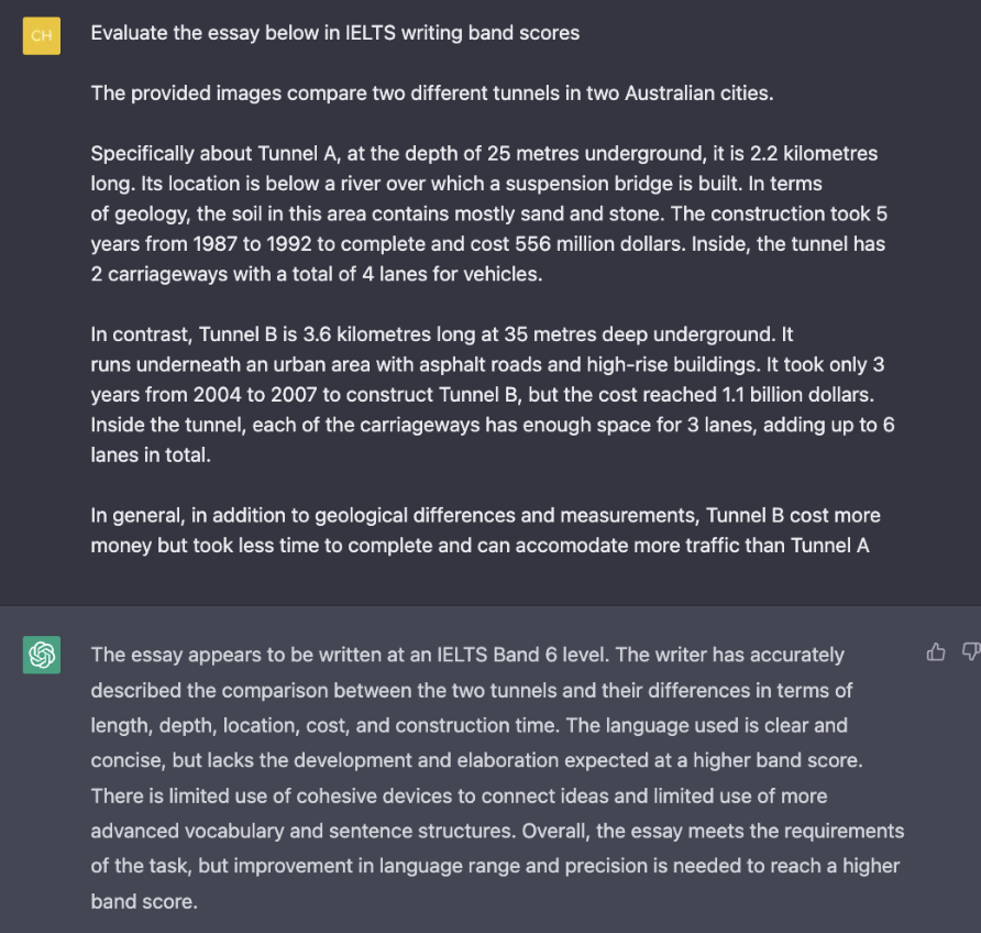 Bên cạnh các chức năng như tìm từ đồng nghĩa, paraphrase, triển khai idea, các bạn học sinh cũng có thể yêu cầu phần mềm chat box AI này chấm bà, đưa ra nhận xét để biết được hiện tại band điểm Writing của bản thân. Chỉ cần gõ “Evaluate the essay below in IELTS writing band scores" + bài viết. Mẫu câu lệnh này có thể áp dụng cho cả bài viết Task 1 và Task 2.
