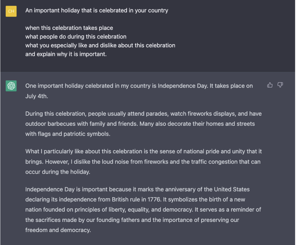 Các bạn học sinh có thể yêu cầu Chat GPT gợi ý những idea cho câu hỏi trong phần IELTS Speaking part 2 và Part 3, bằng cách type phần câu hỏi vào ô chat. Chat GPT sẽ hiển thị một số câu trả lời để các bạn có thể tham khảo. Đồng thời các bạn cũng có thể tham khảo những từ vựng, cụm từ được sử dụng trong bài mẫu để áp dụng cho câu trả lời của mình.