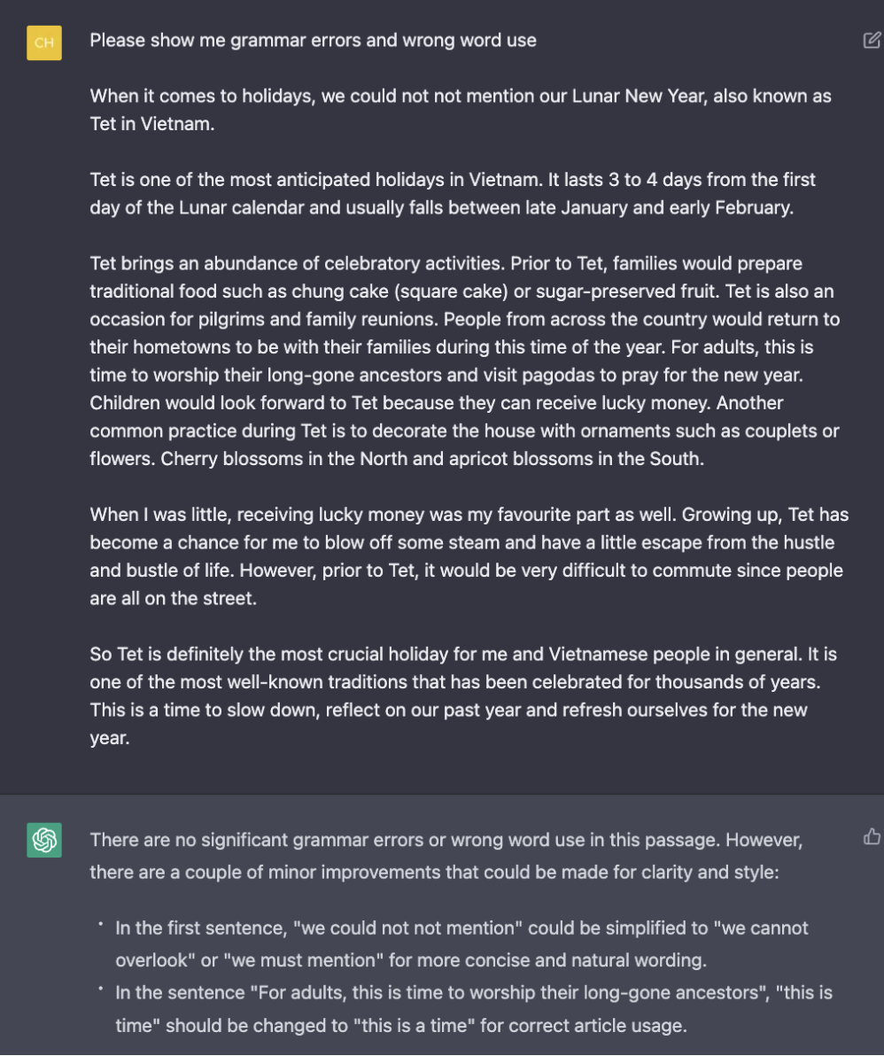 Người sử dụng có thể yêu cầu Chat GPT sửa các lỗi sai về grammar, lỗi đánh máy từ vựng…bằng cách nhập phần Writing hoặc câu trả lời Speaking vào ô chat. Phần mềm sẽ chỉ ra các lỗi sai cũng như đưa ra các nhận xét để các bạn có thể rút kinh nghiệm nhằm cải thiện sự fluency và grammarly correct của mình bằng cách gõ “Please show me grammar errors and wrong word use" + bài viết của các bạn.