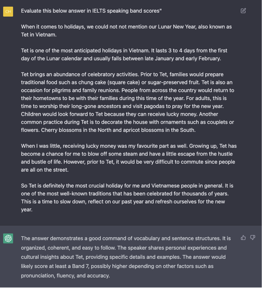 Các bạn học sinh cũng có thể yêu cầu Chat GPT sửa lỗi câu trả lời Speaking của bản thân trong quá trình tự học. Với cú pháp “Evaluate this below answer in IELTS speaking band scores" + bài viết. Mẫu câu lệnh này có thể áp dụng cho cả bài viết part 1, part 2 và parr 3. Nhưng để có hiệu quả cao nhất các bạn có thể ắp dụng vào câu trả lời tại Part 2. Chat GPT sẽ hiển thị một số nhận xét về câu trả lời của các bạn, đồng thời đánh giá band điểm cho câu trả lời này.