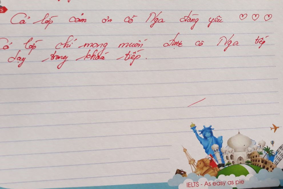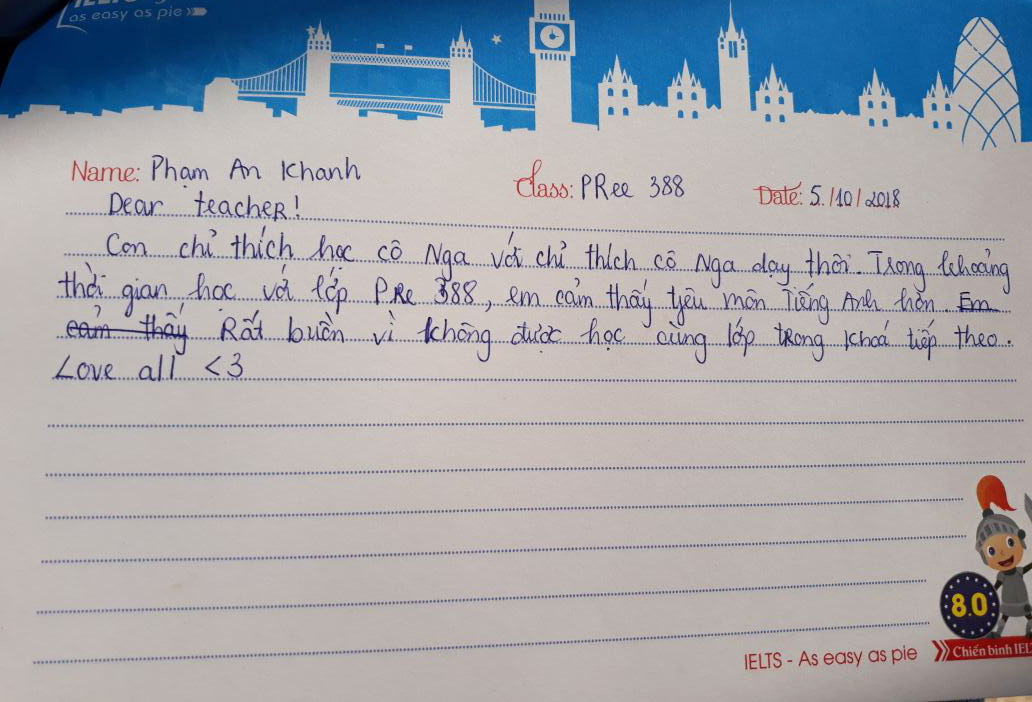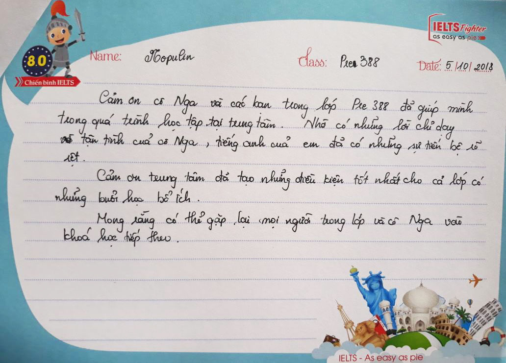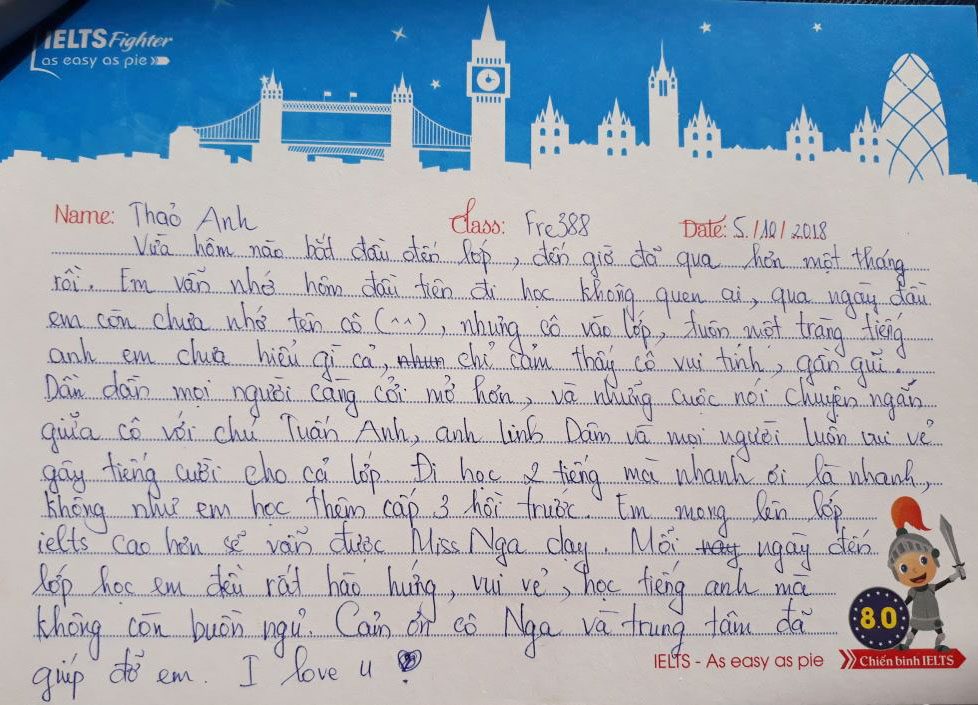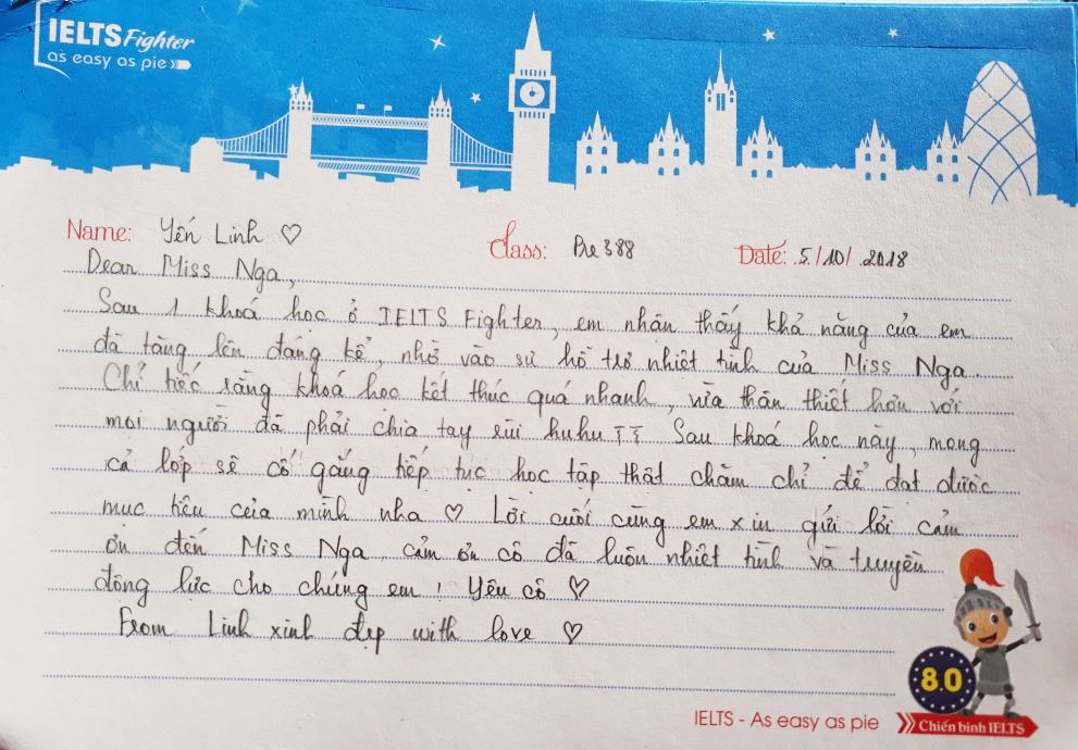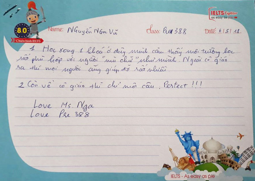Mỗi một lần kết thúc một lớp học, những kỷ niệm còn đọng lại trong mỗi người là những cảm xúc trong trẻo xen lẫn nỗi buồn vì phải chia xa. Lớp Pre 388 của Ms.Nga cũng như thế. Đong đầy yêu thương qua từng nét bút, các bạn gửi tới IELTS Fighter những lời tâm sự và dễ thương. Cảm ơn các bạn đã lựa chọn IELTS Fighter, cảm ơn các bạn đã chọn trung tâm để đồng hành trên chặng đường chinh phục IELTS này. Chúc các bạn thành công trong tương lai.