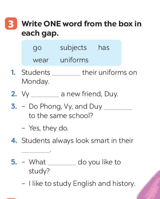 | 1. Vy, Phong, and Duy go to the same school. (Vy, Phong, và Duy cùng đi học một trường) | | |