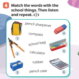 Bài 4. Match the words with the school things. Then listen and repeat.