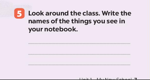 Bài 5: Look around the class. Write the names of the things you see in your notebook.