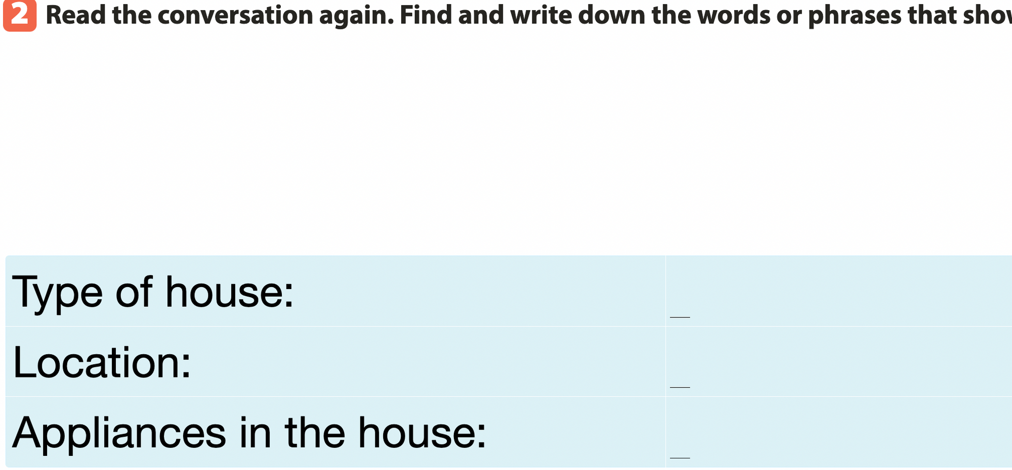 Bài 2. Read the conversation again. Find and write down the words or phrases that show: