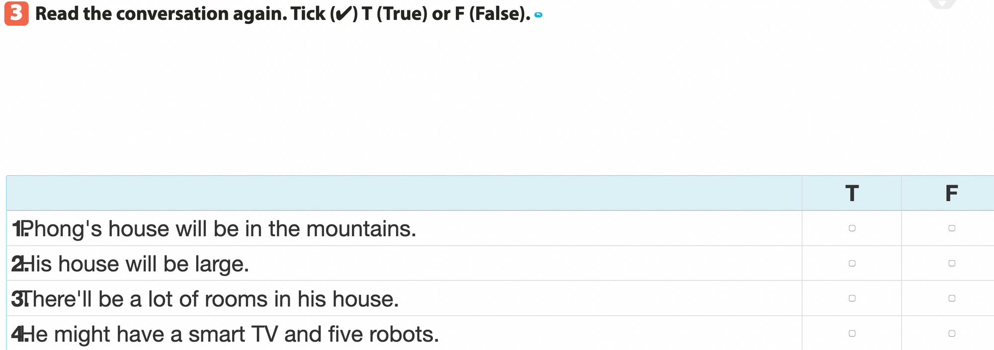 Bài 3. Read the conversation again. Tick T (True) or F (False).