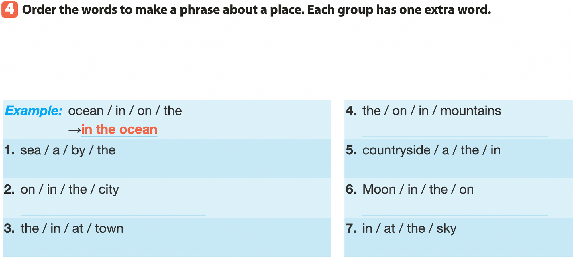 Bài 4. Order the words to make a phrase about a place. Each group has one extra word.