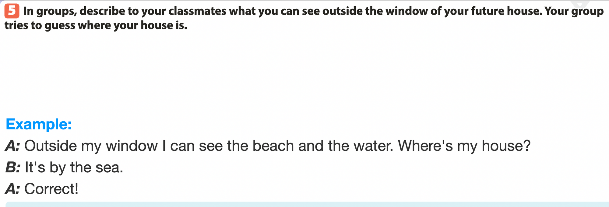Bài 5. In groups, describe to your classmates what you can see outside the window of your future house. Your group tries to guess where your house is.
