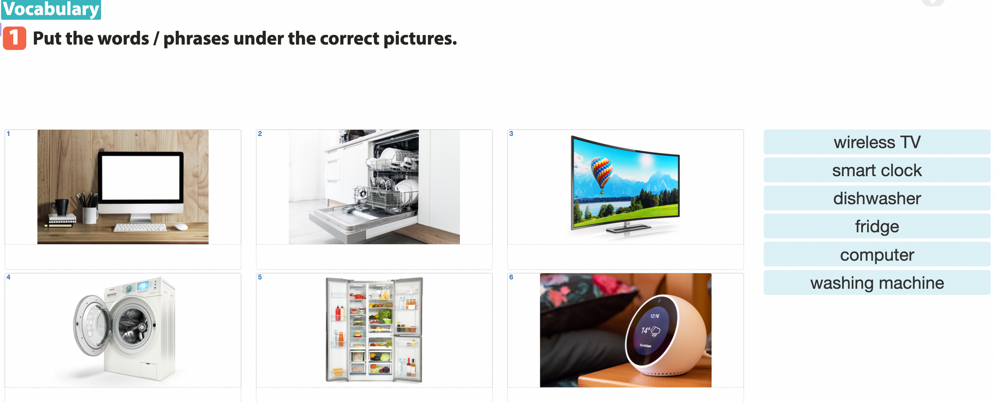 (Viết các từ/ cụm từ dưới các hình ảnh đúng)