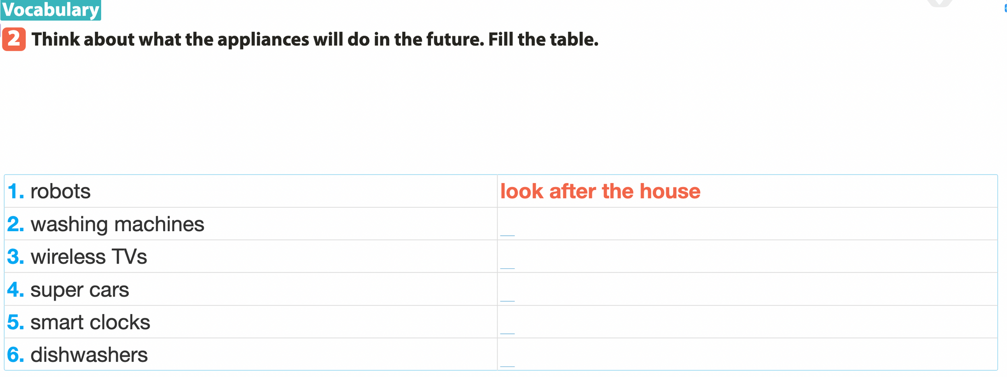 Bài 2. Think about what the appliances will do in the future. Fill the table.