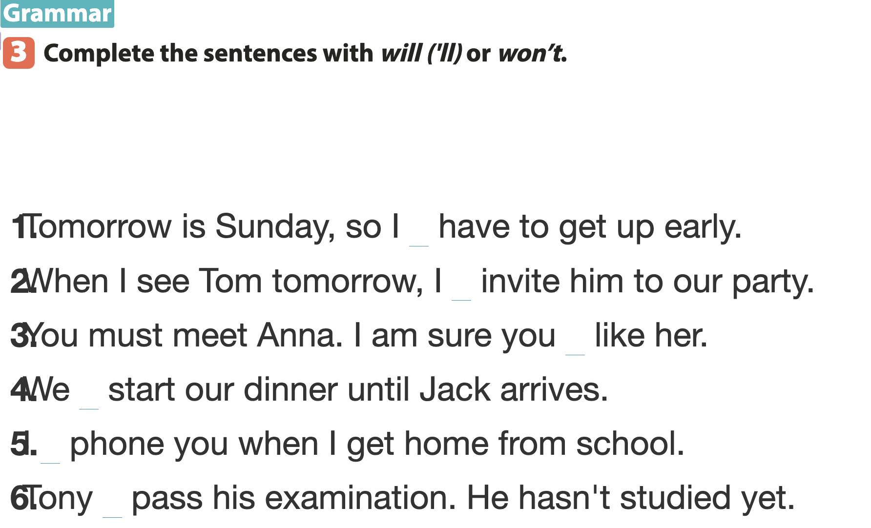 | 1. won’t | 2. will | 3. will |