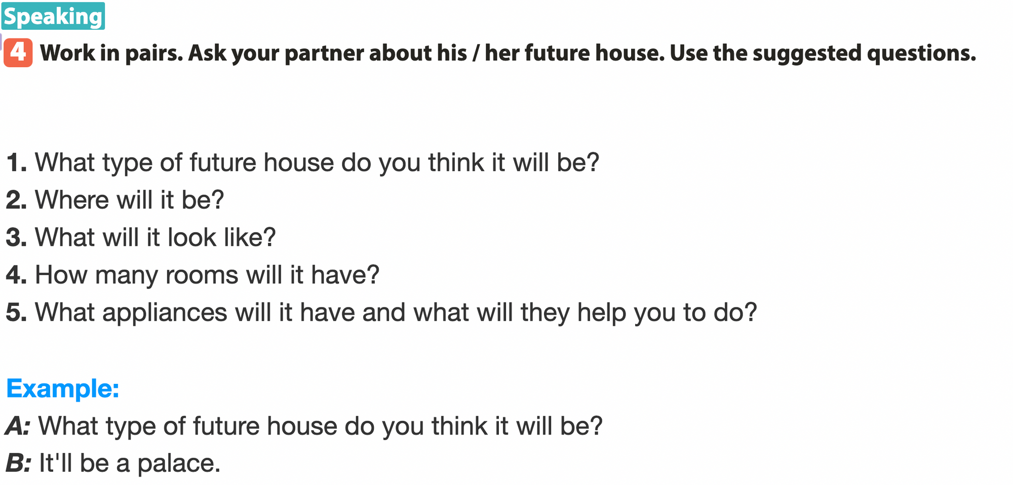 Bài 4. Work in pairs. Ask your partner about his/her future house. Use the suggested questions.