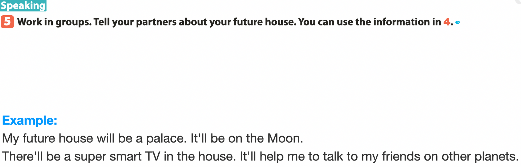 Bài 5. Work in groups. Tell your partners about your future house. You can use the information in 4.