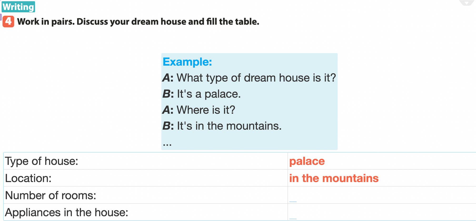 (Làm việc theo cặp. Thảo luận về ngôi nhà mơ ước của bạn và điền vào bảng)