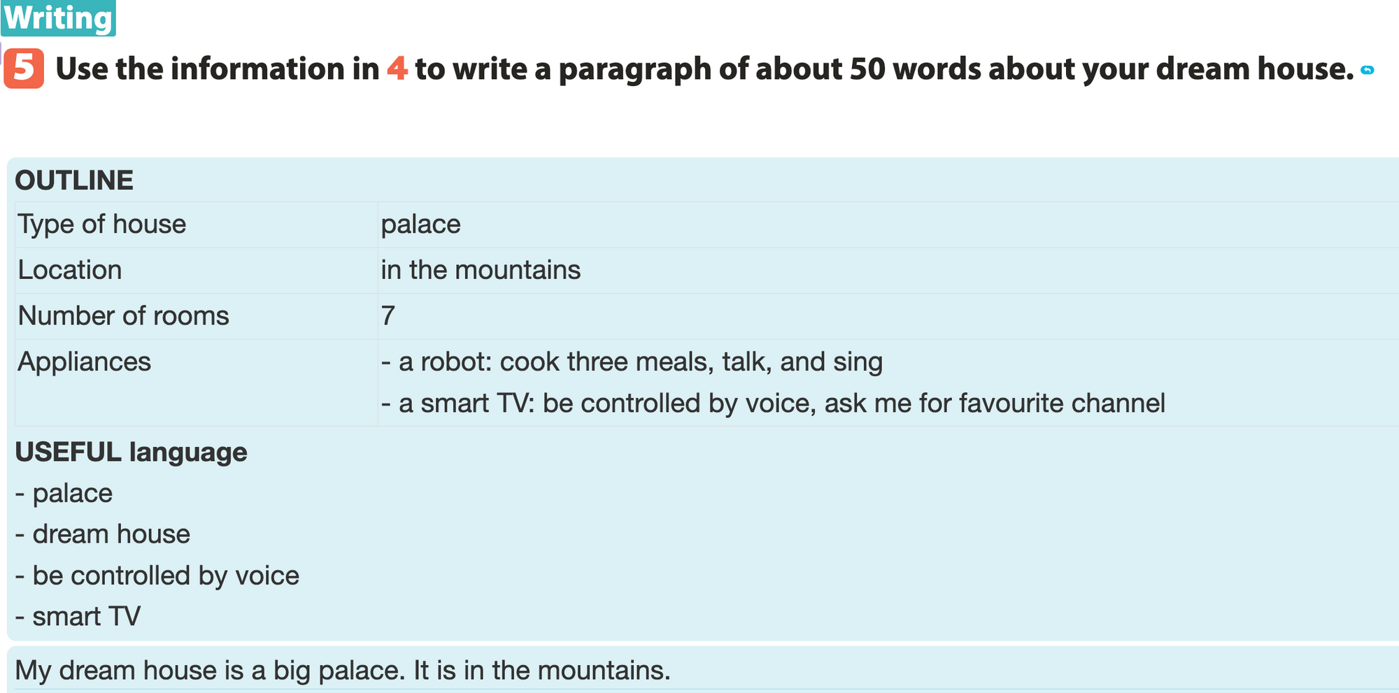 Bài 5. Use the information in 4 to write a paragraph of about 50 words about your dream house.