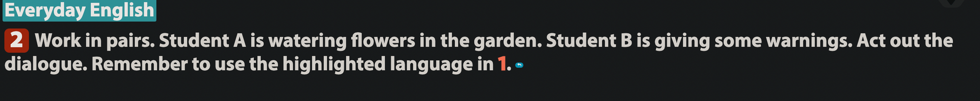 (Làm việc theo cặp. Học sinh A đang tưới hoa trong vườn. Sinh viên B đang đưa ra một số cảnh báo. Diễn lại đoạn hội thoại này. Hãy nhớ sử dụng ngôn ngữ được làm nổi bật trong câu 1)