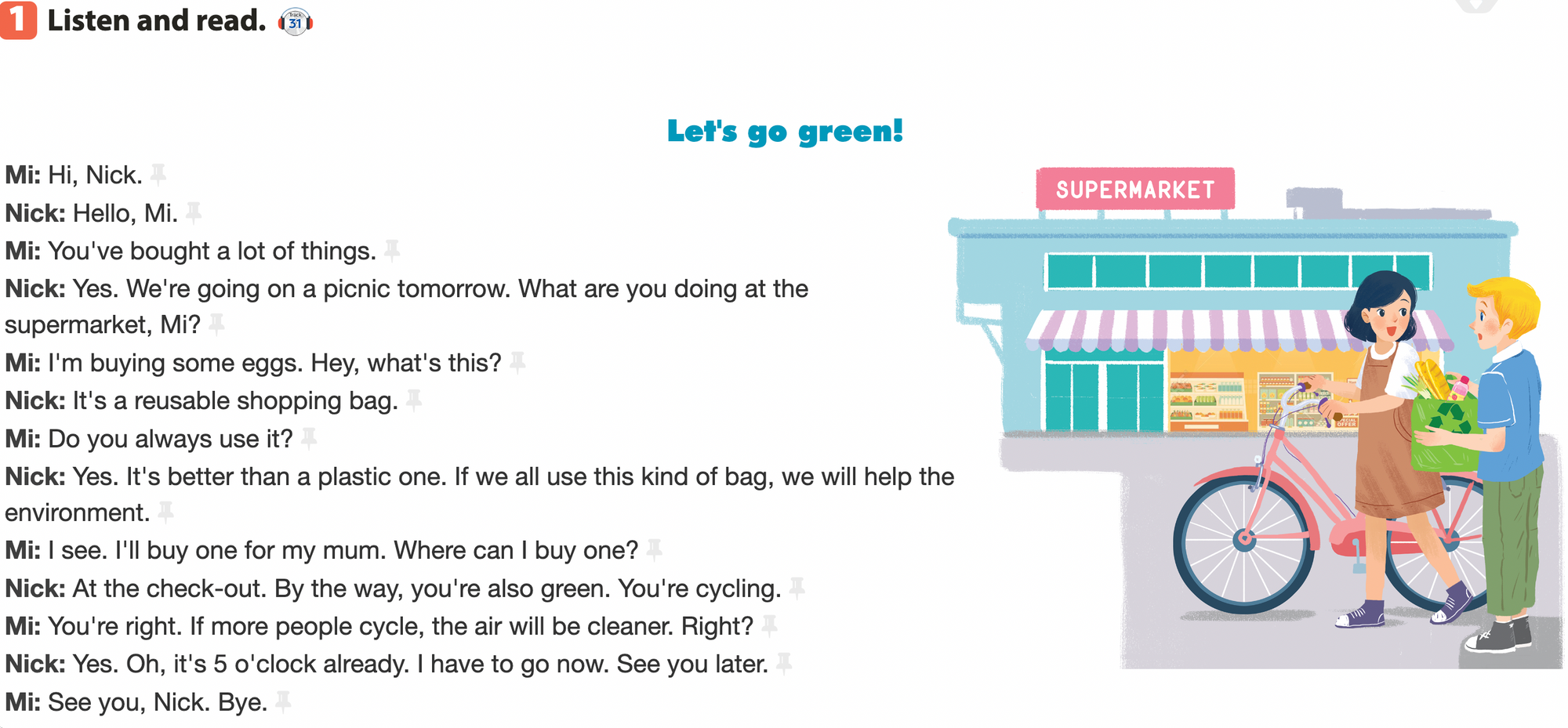 Nick: Yes. We're going on a picnic tomorrow. What are you doing at the supermarket, Mi?