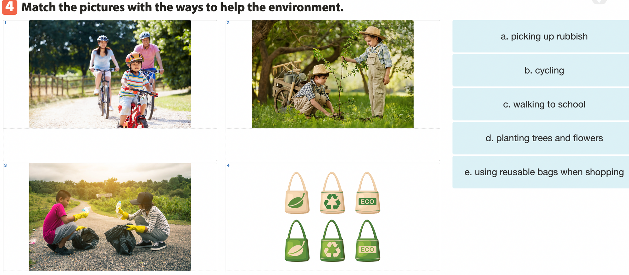 Bài 4. Match the pictures with the ways to help the environment.