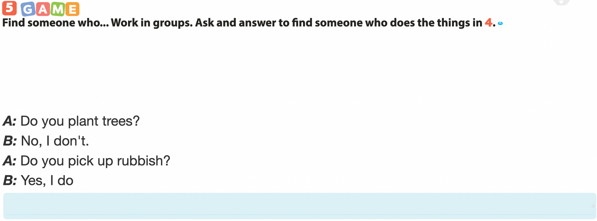 Work in groups. Ask and answer to find someone who does the things in 4.