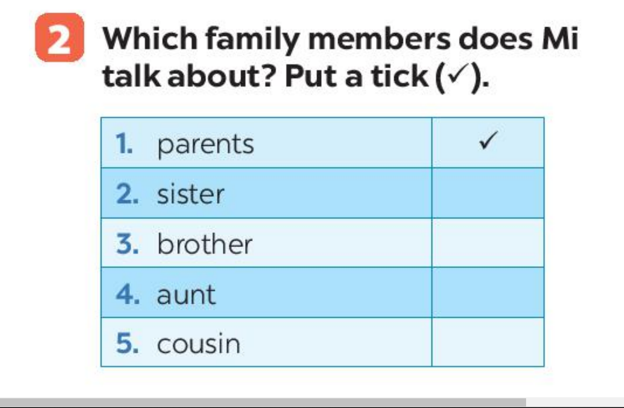 Bài 2. Which family members does Mi talk about? Put a tick (✔).