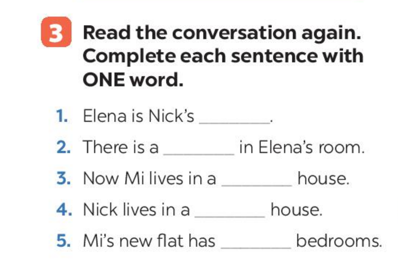 Bài 3. Read the conversation again. Complete each sentence with ONE word.