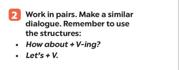 Bài 2. Work in pairs. Make a similar dialogue. Remember to use the structure.