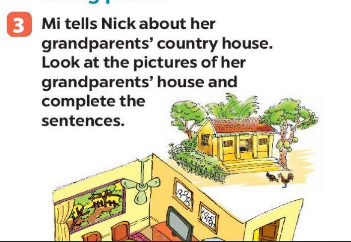 Bài 3. Mi tells Nick about her grandparents’ country house. Look at the pictures of her grandparents’ house and complete the sentences.